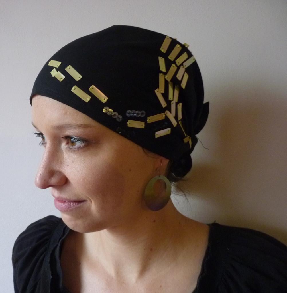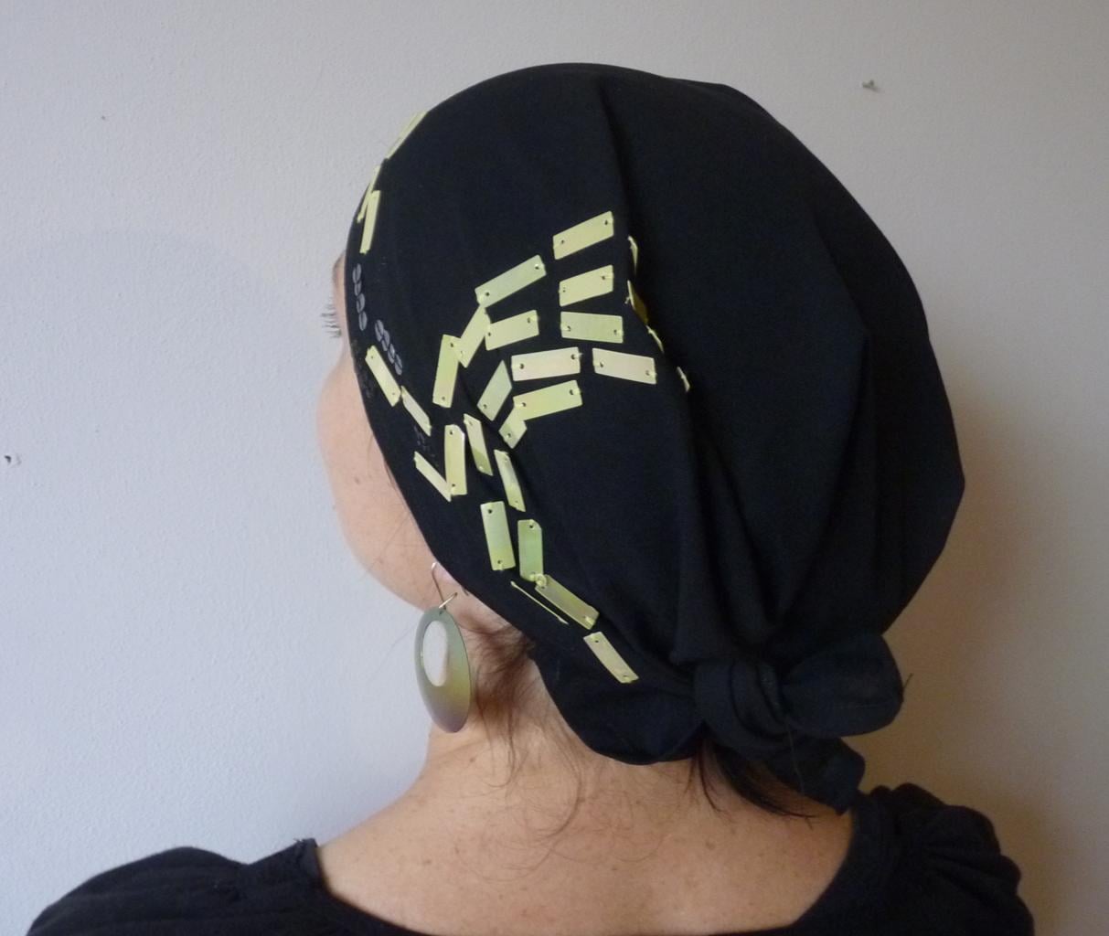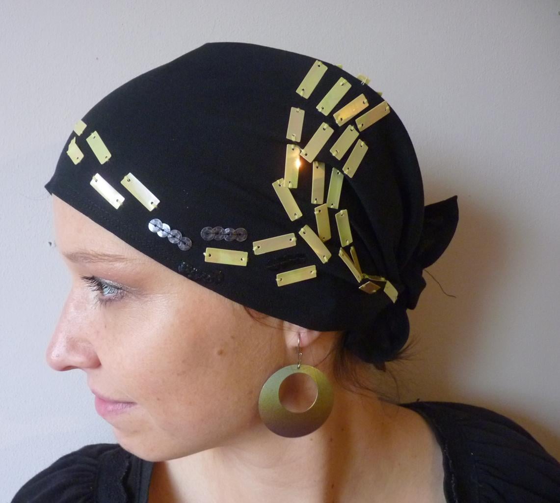 Černý šátek ozdobený třpitivými flitry. První nemalovaný šátek z naší dílny. Šátek posíláme v dárkové krabičce, takže je možné jej hned věnovat. Doporučujeme prát v ruce do 40°C.