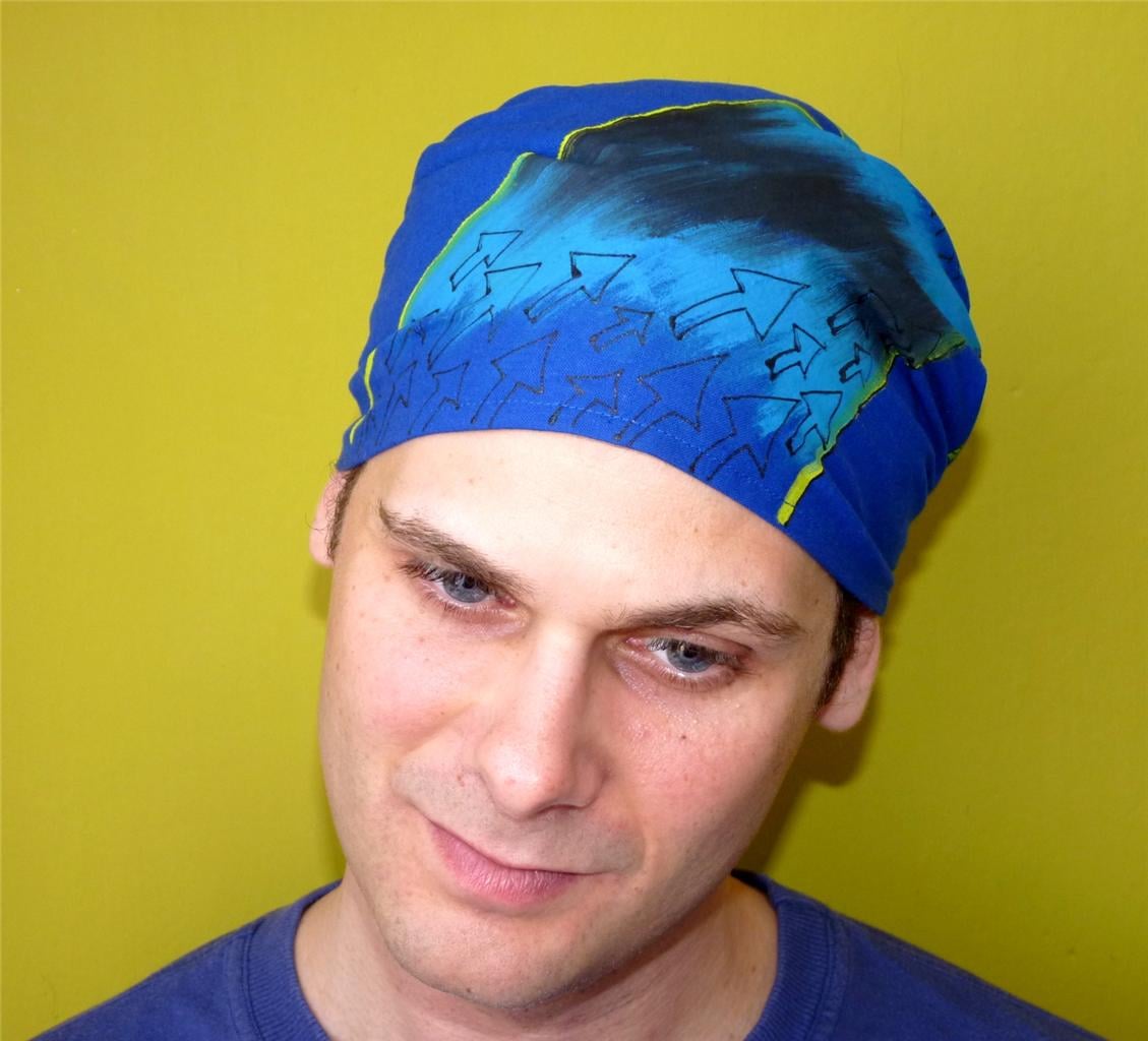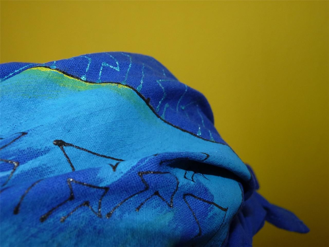 Pánský modrý šátek se symbolem šipky v barvách svítivě zeléné, modré a černé. Velká šipka je dokreslena černou a modrou konturou. Šátek posíláme v dárkové krabičce, takže je možné jej hned věnovat. Barvy jsou i po vyprání stálé. Doporučujeme prát v ruce do 40°C. Žehlit šátek po rubové straně.